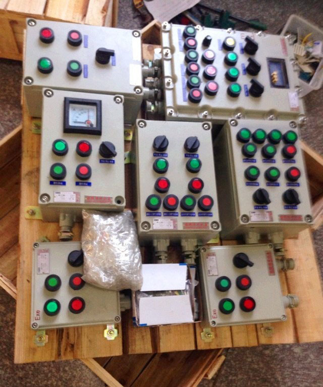 二、防爆控制箱。此類防爆控制箱型號為BXK52系列,其中X是箱體的簡稱,K為控制的縮寫。防爆控制箱主要用于控制各類電機或者輔助電器,主要由防爆按鈕和防爆指示燈組成。防爆控制箱箱體材料一般分為三種,即鋁合金、鋼板焊接和不銹鋼焊接。防爆控制箱箱體除安裝上述按鈕和指示燈外,還可以根據(jù)客戶要求安裝轉(zhuǎn)換開關(guān)、電流表、電壓表以及制定的各類儀表。